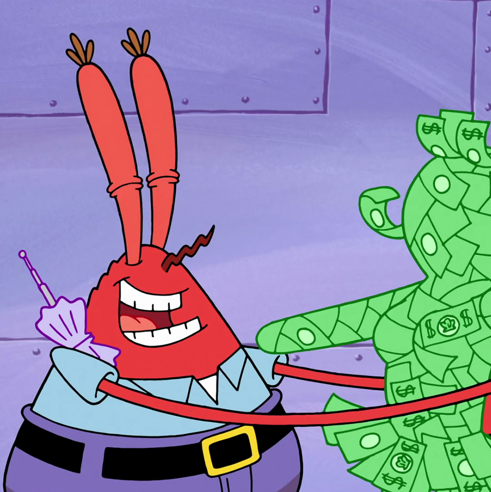 红色螃蟹,本名蟹阿金,在海军服役的外号为"铁甲金钟罩"。视金钱如生命,经常为了一块钱而去冒生命危险,极为自私。快餐店"蟹堡王餐厅的经营者,多次向员工宣导要有时间观念,因为"时间就是金钱"。只要发现能发短财的产品,就会忽视老本美味蟹堡并转换目标。营业时间常在办公室看报纸、数钱、洗金钱浴等,喜欢看讽刺戏剧,和痞老板是死对头。